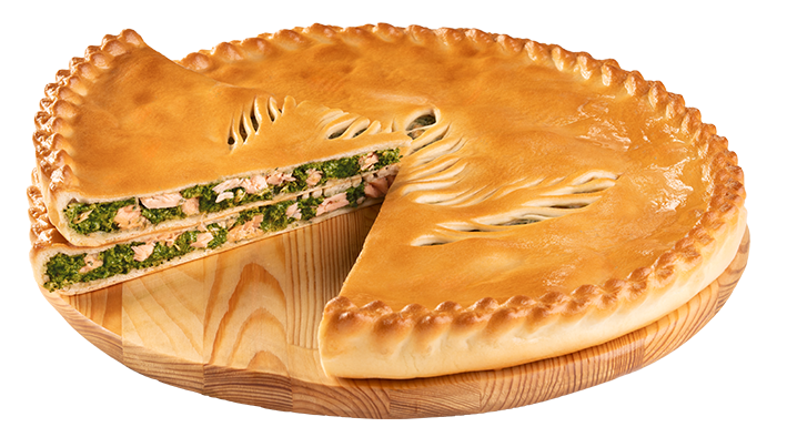 Фирменный пирог в румяном дрожжевом тесте с начинкой из нежного лосося с добавлением сочного шпината, репчатого лука и сливочной моцареллы