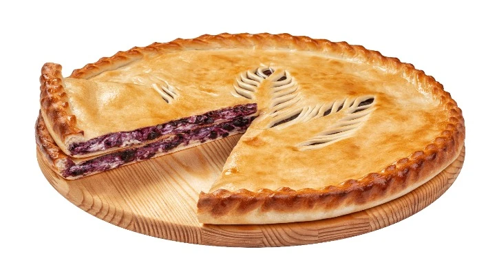 Фирменный пирог, являющийся воплощением нежности, спелая черника в сочетании с легким творожным кремом и нотками лимона, в фирменном тесте